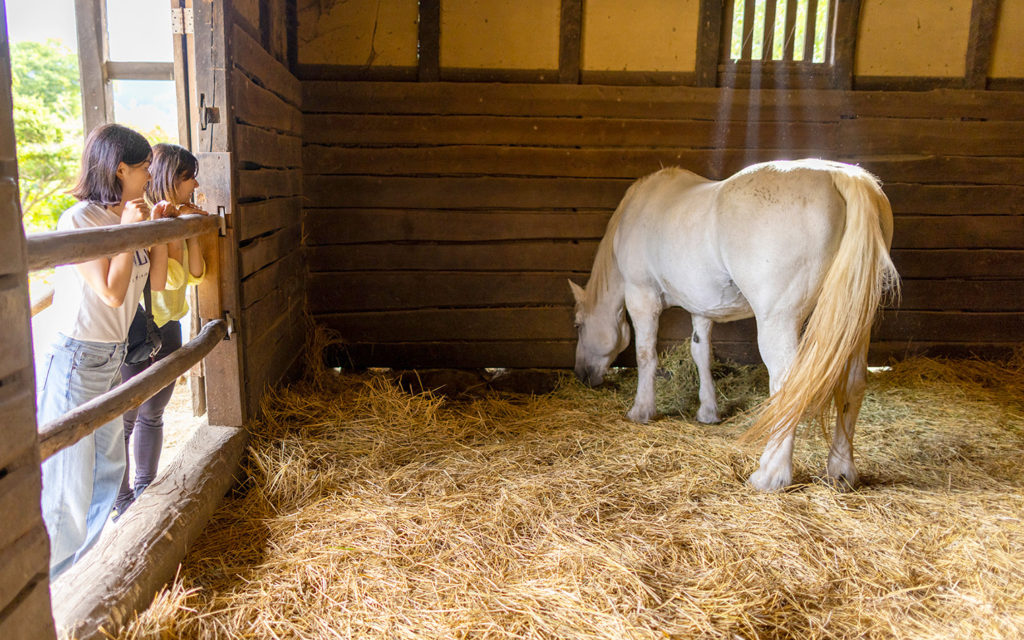 競走馬や乗用馬の育成調教施設。乗馬やふれあい体験(要予約)もあります。